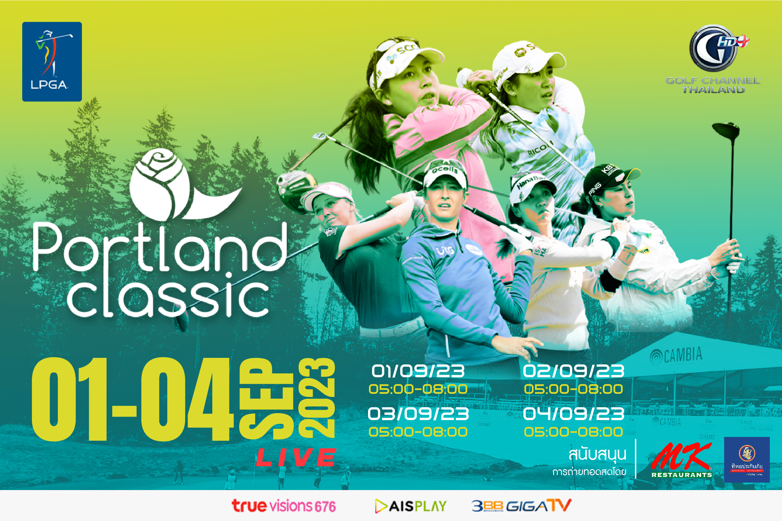 เส้นทาง Race to the CME Globe ทัพนักกอล์ฟสาว LPGA Tour ส่งตรงถึงหน้าจอ เต็มอิ่มเพื่อแฟนกอล์ฟตัวจริง ตามเชียร์นักกอล์ฟในดวงใจของคุณที่มาร่วมตัวกันในรายการ Portland Classic เงินรางวัล 1.5 ล้านเหรียญสหรัฐ สนาม Columbia Edgewater Country Club เมือง Portland รัฐ Oregon ประเทศ สหรัฐอเมริกา และส่งใจเชียร์สาวไทย ที่พร้อมทำศึกระดับโลก