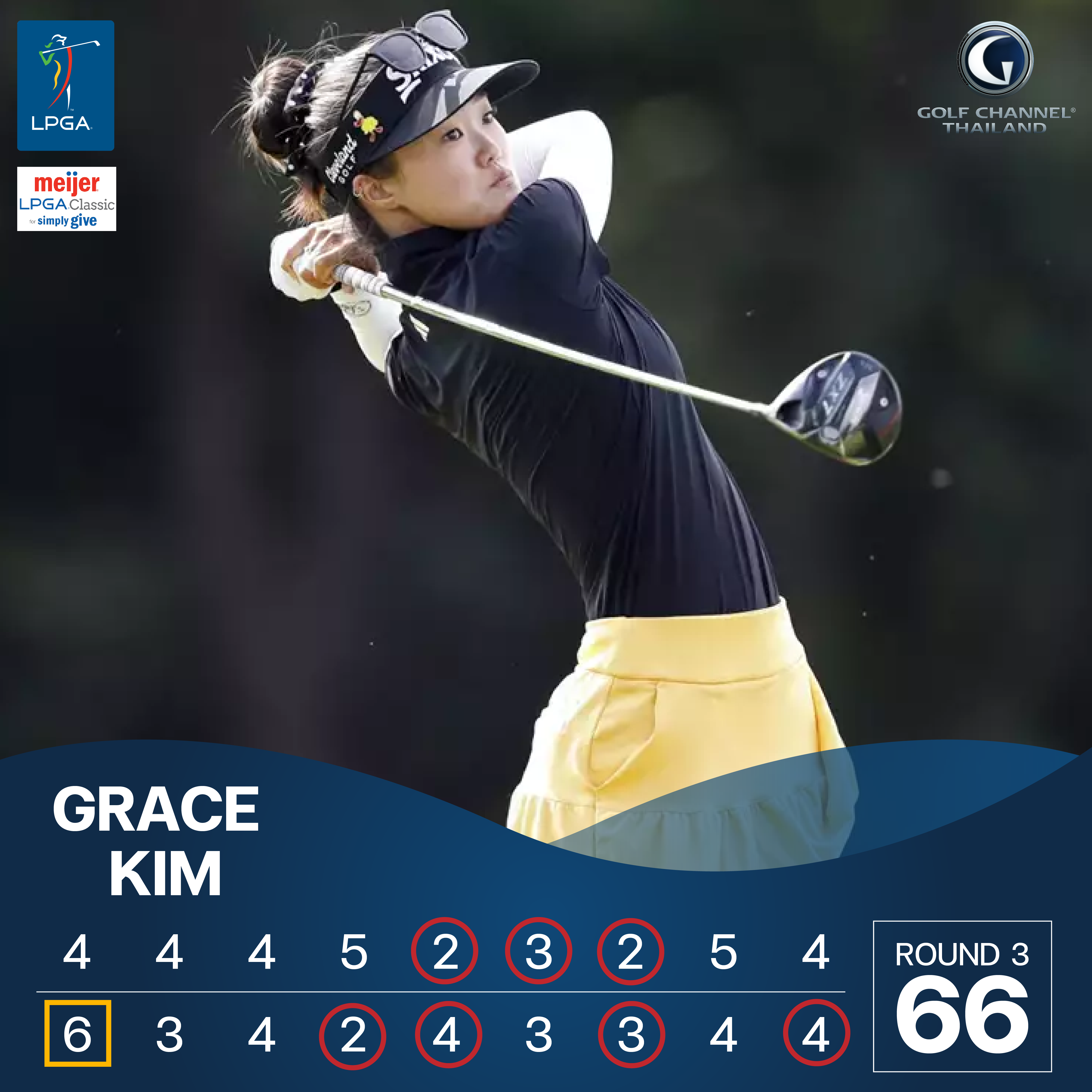 Grace Kim โปรสาวออสซี่ ในรอบที่ 3 ทำสกอร์ 7 เบอร์ดี้ 1 โบกี้  สกอร์รวม -6 (66) ขึ้นนำเดี่ยวด้วยสกอร์รวม 3 วัน 17 อันเดอร์พาร์ (68 65 66 )