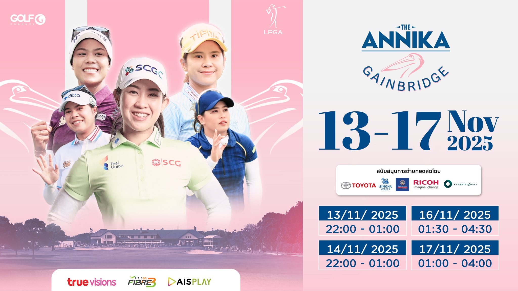 สัปดาห์นี้พบกับการถ่ายทอดสด การแข่งขันกอล์ฟ LPGA Tour รายการ The ANNIKA driven by Gainbridge at Pelican 2025 แข่งขันที่สนาม Pelican Golf Club ประเทศสหรัฐอเมริกา ชิงเงินรางวัลรวม $3,250,000 หรือประมาณ 105 ล้านบาท